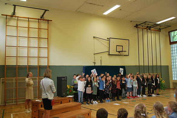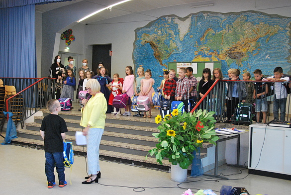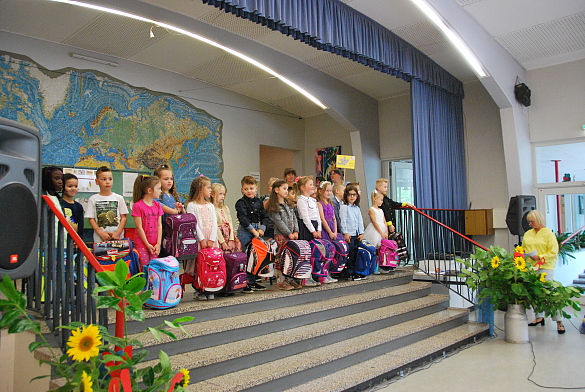 In der Aula und in der Turnhalle fanden parallel die Einschulungsfeiern für die Klassen 1a, 1b, 1c und 1d statt. Begleitet von ihren Eltern und manchmal auch Geschwisterkindern konnten die Erstklässler ihren ersten Schultag an der Schule erleben.