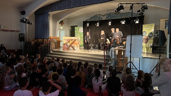 Beim kleinen Schulkonzert „Von Streicherklang und Froschgesang" bekamen wir Besuch von einem Streichquartett. Gemeinsam mit einem lustig-frechen Frosch lüfteten die Musiker die Geheimnisse von Geige, Bratsche und Cello.