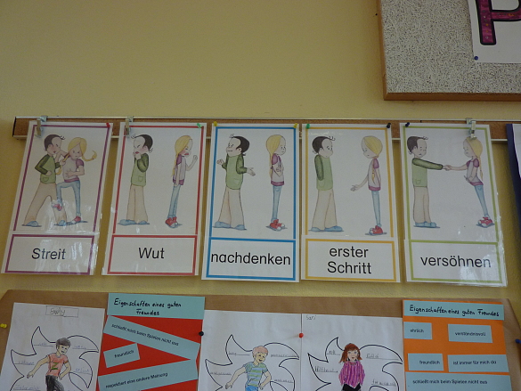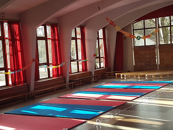 Nachdem unsere Schule 2006 teilweise renoviert wurde, haben wir die Flure und die Pausenhalle in der Projektwoche verschönert. Da wurden Tische und Bänke gestrichen, dekorative Wandbilder gestaltet sowie Türumrandungen und Säulen mit Mosaiksteinen verziert.