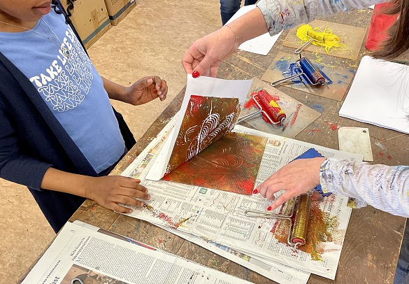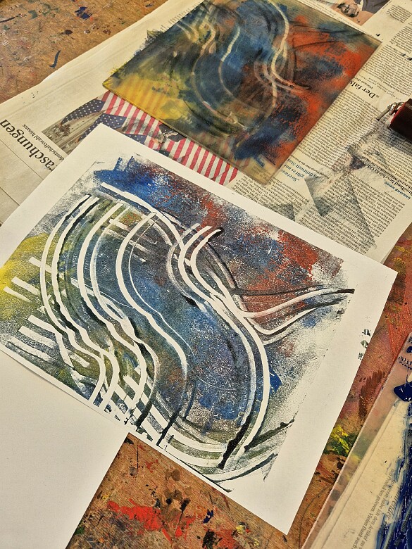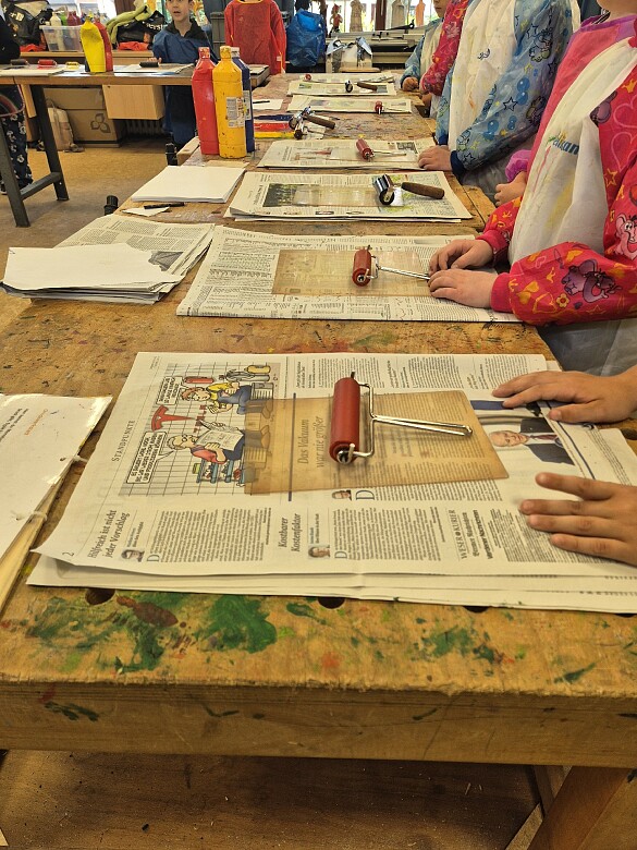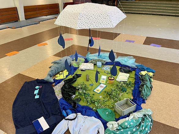 Die Mitarbeiter des Museums richteten verschiedene Mitmachstationen in unserer Schule ein. Eine der spannendsten Attraktionen war die "Farbdusche", bei der die Kinder sich komplett in Gelb, Grün, Rot oder Blau kleiden konnten und dann in einer entsprechenden Umgebung die jeweilige Farbe intensiv erleben durften. An der Duftbar konnten farbige Getränke probiert werden, um herauszufinden, wie Farbe schmeckt. In der Druckwerkstatt hatten die Kinder die Möglichkeit, eigene farbige Bilder zu drucken, während in der Klangwerkstatt verschiedene Instrumente den passenden Farben und Formen zugeordnet wurden. Zudem konnten die Kinder farbige Gedichte schreiben, die ihrer Fantasie freien Lauf ließen.