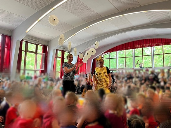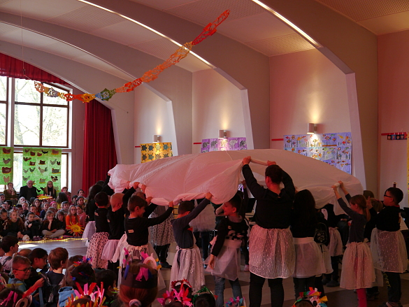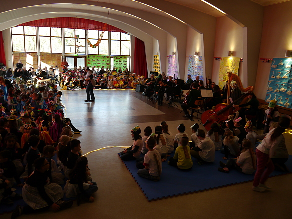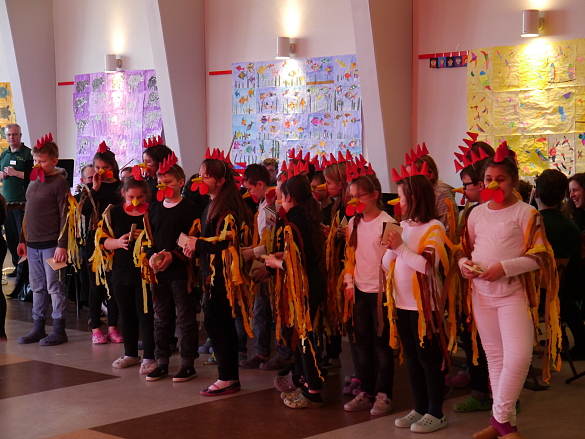 Der Höhepunkt war dann die Abschlussveranstaltung, auf der jede Klasse nach der Musik der Philharmoniker eine kleine Aufführung vor dem Publikum darbot. Da kamen sie alle - die Löwen, die Hühner, die Schildkröten, die Elefanten, die Fische (Aquarium), die Vögel (Vogelhaus), die Schwäne und die Fossilien.