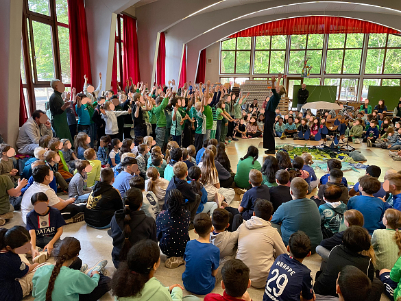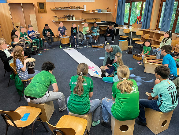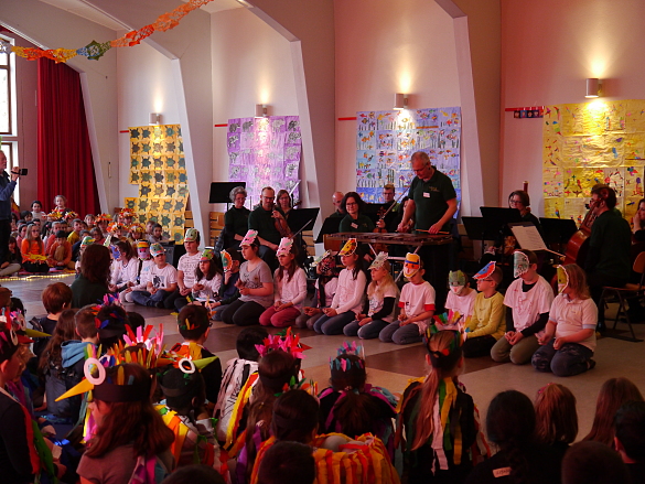Zum großen "Trommelzauber" am letzten Tag der Projektwoche trafen sich alle Kinder, Lehrer und viele Eltern in der Turnhalle. Johnny Lamprecht und DJ Dr. Fofo begeisterten alle mit ihren afrikanischen Geschichten und Liedern zum Mittrommeln und Mitsingen.