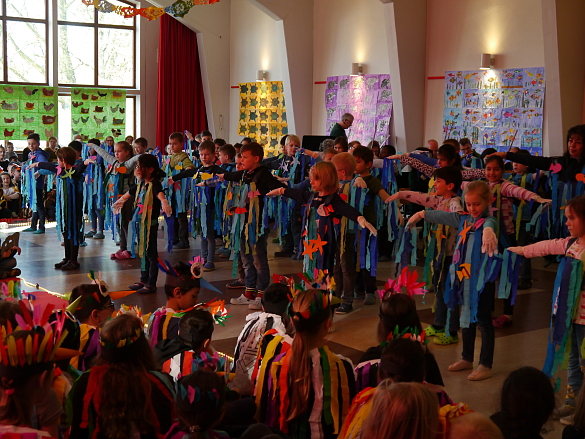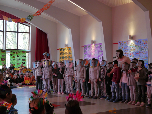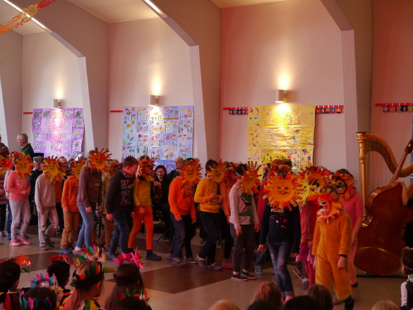 So beschäftigten sich dann auch alle Klassen mit ihren Lehrerinnen und Betreuerinnen während der Projektwoche intensiv mit der Musik, den Kostümen und den Tieren zum "Karneval der Tiere". Es entstanden tolle Tierbilder und Kostüme wurden in liebevoller Handarbeit hergestellt. Die Schülerinnen und Schüler hörten die Musik von Saint-Saens, improvisierten zu den Instrumenten und übten kleine Choreografien ein.