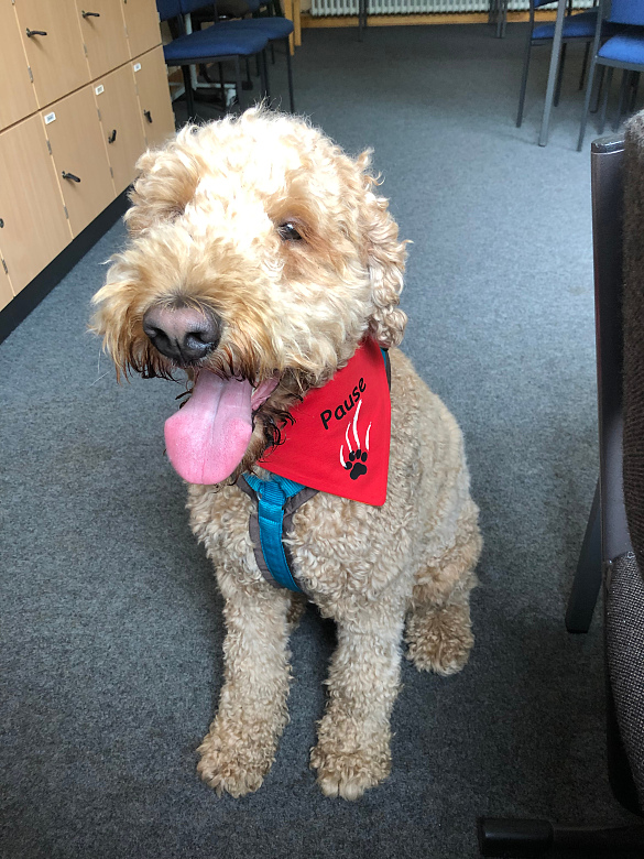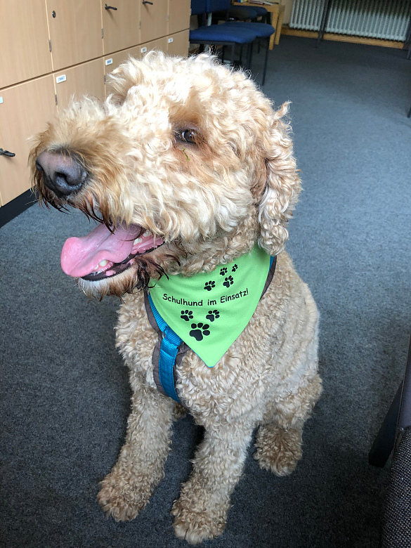 Damit alle Kinder besser unterscheiden können, wann Molly im Einsatz ist und wann sie auch mal Pause hat, trägt sie nun immer ein entsprechendes Halstuch. Grün bedeutet "Molly im Einsatz". Sie besucht dann mit ihrem Frauchen Frau Brosk die Klassen und darf gerne gestreichelt und angesprochen werden.