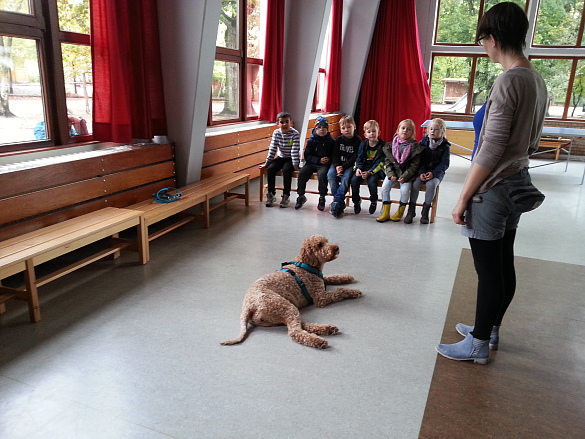 Im Oktober haben alle neuen Erstklässler die Gelegenheit, unseren Schulhund Molly kennen zu lernen. Frau Brosk zeigt ihnen, wie man richtig mit einem Hund umgeht und was Molly schon so alles in der Hundeschule gelernt hat. In kleinen Gruppen erfahren die Kinder, wie man sich Molly nähern kann, wie sie gestreichelt werden sollte und was man alles bedenken sollte, wenn man Molly in der Schule begegnet.