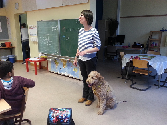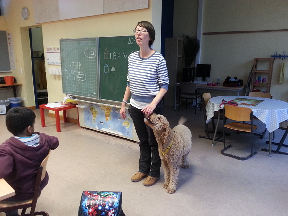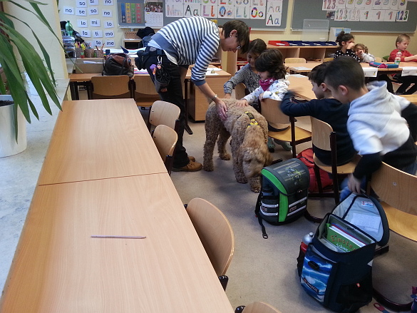 Derzeit besucht Molly gemeinsam mit ihrem Frauchen Frau Brosk nach und nach alle Klassen der Schule. Frau Brosk informiert die Schülerinnen und Schüler über den richtigen Umgang mit Hunden und stellt verschiedene Verhaltensregeln vor. Alle Kinder sind sehr interessiert und viele bringen auch ihr eigenes Wissen über Hunde mit ein.